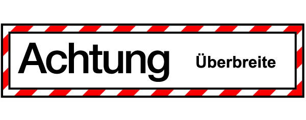 LKW-Schild „Achtung“ / 200 x 800 mm. Grund: weiß, Druck: schwarz, Rand: weiß-rot. Ausführung: Stahlblech, „Überbreite“